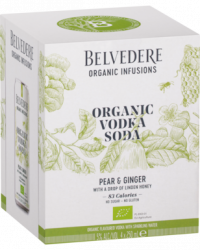 Organic Belvedere Vodka with botanical infusions and organic fruit blended with light sparkling water. Juicy organic pear and subtly spicy ginger, well balanced with a touch of honey. Best served chilled or over a ice.